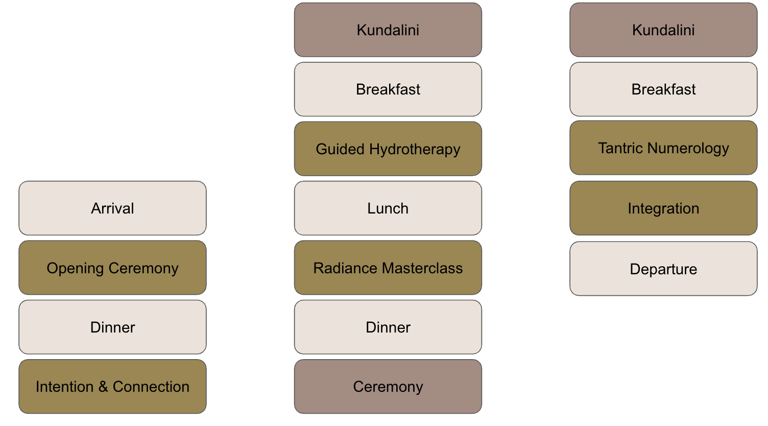 On Days 2 and 3, the focus shifts toward spiritual growth and integration. A Tantric Numerology workshop offers insight into personal energetic patterns and includes a personalized 40-day integration practice to support life beyond the retreat. This practical life-science toolkit supports nervous system regulation and grounded integration. The journey culminates in Aquarian Sadhana, designed to deepen inner stillness and support lasting integration beyond the retreat space.